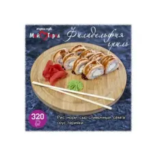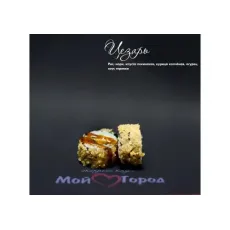 Состав: рис, нори, сыр сливочный,, мясо краба, огурец, соус Яки