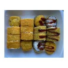 Рис, нори, творожный сыр, копченая курица, обвален в кляре и сухарях панко, жареный во фритюре, полит соусом терияки. 8шт.