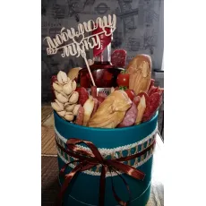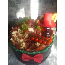 Букет в яркой упаковке.Вкусный мясной,с копчеными сырами и колбасами.также в составе вкусные орешкии и томаты...