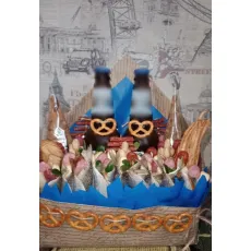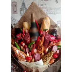 Очень вкусный, интересный и ароматный букет с любимым напитком. Здесь несколько видов колбасы и сыра. Овощи придают...