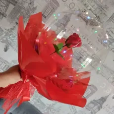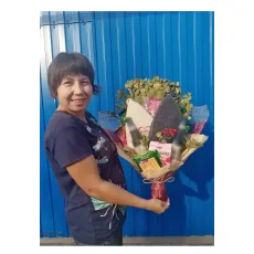 Красивый букет очень яркий и интересный,с добавлением живого цветка(стоит в колбе с водой)Упаковка в цвет...