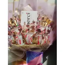 Букет из открытого шоколада и конфет, пирожных Макарона. Состав: -макаронсы клубника, лимон -конфеты комильфо с...