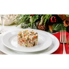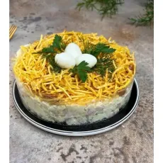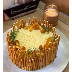 Копчёная курица, шампиньоны, яйца, маринованные опята, солёная соломка, майонез, зелень, чеснок. Цена указана за...