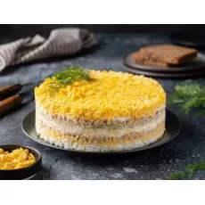 Горбуша консервированная, картофель, морковь, лук, яйцо, сыр, майонез. Цена указана за 100гр. Предзаказ за 4часа