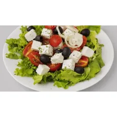 Помидоры, огурцы, перец болгарский,маслины, лук, масло оливковое, сыр Фета. Вес 300гр