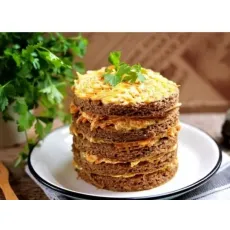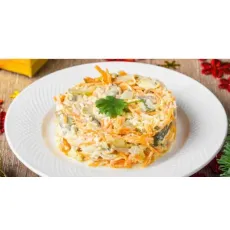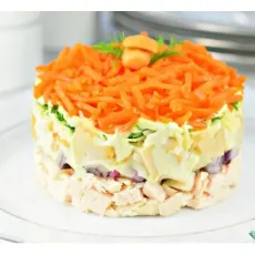 Куриная печень, шампиньоны, лук, маринованные огурцы, морковь, майонез. Цена указана за 100гр. Предзаказ за 4 часа.